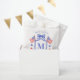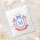 This patriotic bridal shower favor bag design features a watercolor crest with a red white and blue patriotic crest with American flags and a blue bow. ou can personalize with your monogram and name.