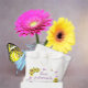 Uma borboleta está a caminho! Borboletas rosa, púrpura e amarela e rosas amarelas ensolaradas contra uma armação geométrica rosa