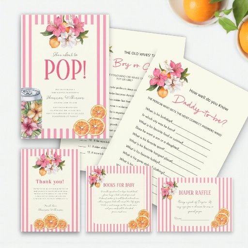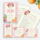 Celebrate the mom-to-be with these charming "About to POP!" baby shower favor bags, featuring a vibrant tropical floral design and refreshing citrus slices. The playful phrase "Shannon's about to POP!" adds a delightful touch, perfectly complementing the theme of anticipation and joy. These bags are ideal for holding small treats, candies, or keepsakes, making them a wonderful addition to your baby shower decorations. The colorful hibiscus flowers and juicy orange slices create a summery, festive atmosphere that guests will adore.