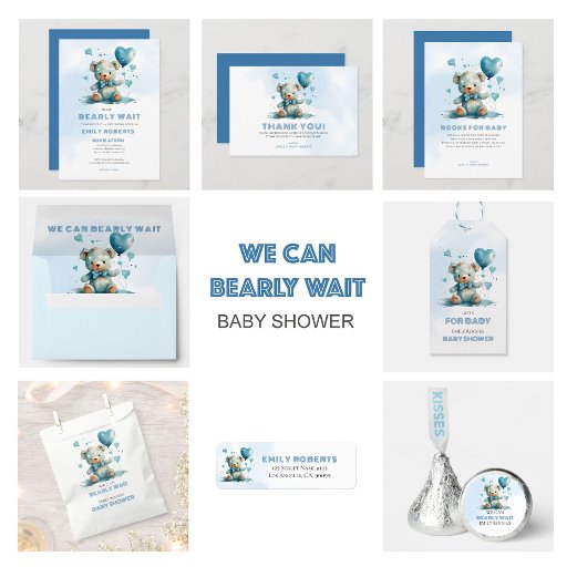 Este design de envelope bonito com chá de fraldas de apresenta um adorável ursinho de pelúcia a aquarela com balões em forma cardíaca, e tipografia azul e preta personalizável - podemos esperar muito pela tipografia personalizável.