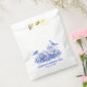 Essas bolsas favoritas têm um design monocromático com um conjunto de chá azul e branco cercado por aves e flores. Abaixo do gráfico, há um lugar para você adicionar seu nome e tipo de evento, bem como a data do evento. Estas bolsas são perfeitas para uma festa de chá, festa de aniversário ou chá de panela.