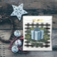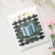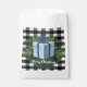 O presente de pacote favorece este feriado com uma Xadrez de Buffalo. O design de bolsa de favores apresenta um presente de Natal embrulhado em listras, enfeitado em verde de Natal contra um fundo de gingham preto e branco. Itens adicionais de presentes e feriados disponíveis com este design também.