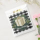 O presente de pacote favorece este feriado com uma Xadrez de Buffalo. O design de bolsa de favores apresenta um presente de Natal embrulhado em listras, enfeitado em verde de Natal contra um fundo de gingham preto e branco. Itens adicionais de presentes e feriados disponíveis com este design também.