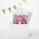 Pretty pink anime girl with headphones with cat ears themed birthday party favor bag. Cute for pre-teen girls that like gaming and music! Pink, blue floral background.