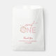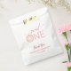 Esta bolsa de favores do primeiro aniversario desta menina apresenta um texto elegante lendo "UM doce" acentuado com uma rosquinha de fosco cor-de-rosa e aspersores. O texto personalizado permite personalizar com um obrigado que você envia e o nome da criança.