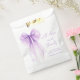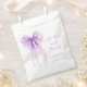 Elegant bridal shower favor bags featuring a watercolor of a purple coquette bow, "with love and thanks" showcased in a chic purple script, and the name of the bride and shower date.