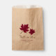 Casamento outono personalizado favorece bolsas. Folhas de outono de na moda burgundy e uma escrita marrom rusticada "Fall in Love". Personalize facilmente com os nomes da noiva e noiva e a data do casamento.
