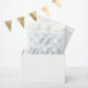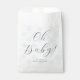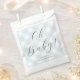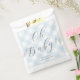 Esta bolsa de favores simples, mas na moda, apresenta um fundo doce de gingham azul-bebê com uma elegante saudação de roteiro de caligrafia que diz "Oh Baby". Os itens de coordenação estão disponíveis na coleção.