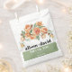 Esta bolsa de favores de casamento mostra um galho com flores de rosa de pêssego e folhas verdes de sábio, exuando uma vibração romântica e sofisticada. Os nomes dos casais são destacados em caracteres negros, dando um toque personalizado ao favor. Além dos nomes, uma nota sincera de "Obrigado" é incluída para expressar apreço aos convidados por compartilharem no seu dia especial. Para melhorar a estética geral, uma banda verde de sábio é posicionada com bom gosto na base do saco, juntando sem esforço todo o olhar.