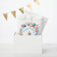 Um rato giro vestindo uma festa listrada no arco-íris cercada por uma coroa colorida de flores e balões. As palavras "Feliz Aniversário" podem ser facilmente modificadas para qualquer saudação.