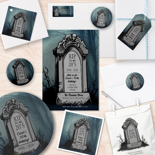 Celebre girar 30 (ou 40 ou 50) em estilo com esta bolsa de favorecimento de festa de aniversário "RIP para os meus 20 anos" assustadora! Apresentando um design de tombstone assombroso, e uma carta gótica ousada, este saco de favores define o clima para uma celebração de marco, incluindo um aniversário de 30 anos, uma festa de teatro do RIP 20, ou uma festa de aniversário gótica! Perfeito para qualquer um que ama uma vibração divertida, dramática e um pouco assustadora para a sua celebração de marco. Perfeito em dar presentes. Disponível com produtos correspondentes.