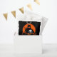 um design temático de pirata com uma grande lua de Halloween laranja e um crânio e ossos cruzados de Jolly Roger na vela de um navio pirata. Saque é escrito em letras laranja e preto em negrito. Para aqueles truques ou guloseimas especiais ou para aquela festa de Halloween.