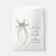 Elegant bridal shower thank you favor bags featuring a sage green watercolor of a delicate coquette bow, "with love and thanks" in a chic script, and the name of the bride and shower date in modern lettering.