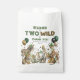Apresentando uma design caprichosa que captura perfeitamente o espírito da selva, esta bolsa de favor fofa impressiona seus convidados. A design apresenta uma variedade de animais silvestres, entre leões, zebras e elefantes, cercados por folhas tropicais exuberantes e balões coloridos em tons de verde, preto e ouro. A impressão leopardo adiciona um toque de natureza selvagem e diversão à design, enquanto a tipografia brincalhona dá o tom para uma celebração alegre.