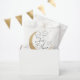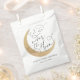 Design apresenta uma lua de ouro falsa com "Estamos sobre a lua" em um texto de caligrafia fofo. Personalize com suas informações ou clique em "Clique para personalizar mais" para editar estilos de fonte, tamanho e cores.