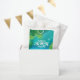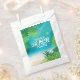 Design de festas de praia de verão com palmeiras e faíscas ao fundo.