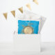 Em um pano de fundo azul brilhante estão estrelas douradas e uma tartaruga-do-mar dourada com uma esfera de ouro onde você pode personalizar seu evento. Víblias de vidro feminino cômico.
