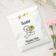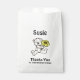 Esta bolsa de favores apresenta um ursinho bonito segurando uma flor amarela acima de Obrigado. Todo o texto pode ser personalizado para ajustado do evento.