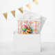 Adorable personalized capybara themed birthday party thank you favor bags. A sweet watercolor capybara holding a balloon and birthday gift in pink and blue.