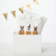 Ilustração de três cachorros franceses do Bulldog de diferentes cores em abóboras vestidas em trajes de Dia das Bruxas.