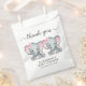 Obrigado bonito, você favorece bolsas para sua filhinha gêmeos chá com "obrigado você" em um roteiro de cinza macia com pestanas e uma aquarela rosa de elefantes gêmeos. Personalize o nome da futura mãe e a data do chá em uma simples tipografia de cinza.
