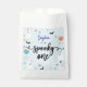 Uma bolsa de primeiro aniversario de Halloween, um fantasma de bebê azul e fofo. Design moderno do Dia das Bruxas para uma festa assustadora! Esta bolsa de favores de aniversário apresenta teias de aranha, fantasmas, abóboras, morcegos, aranhas, folhas, cornas, estrelas e margaridas. Esta bolsa de favor é excelente para festas de aniversário de garotinho!