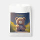Esta Bolsas de Favor apresenta um ursinho de pelúcia fofinho no meio de um campo de flores contra o céu noturno. Urso marrom, flores amarelas, céu azul. Maravilhoso, Bolsas personalizadas para chá de fraldas, aniversário de criança e muito mais! Minha ideia, gerada com IA.
