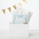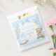 Imagem de aniversário com fundo azul, apresentando um urso com um arco azul ao redor do pescoço, um cavalo de balanço branco com pontos azuis e balões azuis e beges