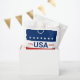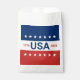 Celebrating the USA's 250th anniversary. This red, white, and blue favor bag has the word 'USA' in the center. The years 1776 and 2026 are next to USA. The top stripe is blue and has white stars. The center stripe is white. The bottom stripe is red with white stars.