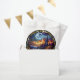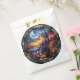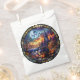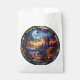 Este design de vidro manchado apresenta um caldeirão de bruxa, jack-o-lanternas, e morcegos nadando sobre um castelo sob o luar do cheio.