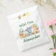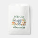 Aquarelas Safari Selvagens Selvagens Selvagens Uma Primeira Festa de aniversário Favorece Bag / Treat Bag. Os bebês incluem elefante, macaco, girafa, rinoceronte, zebra e leão nas folhas de samambaia. Cores d'água, vegetação botânica. Texto Verde.