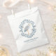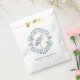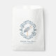 Um saco de favores baleares apresenta uma cegonha de cinzas cercada por um rossel azul inspirado em um fundo azul. A cegonha tem um design de arte popular embelezado em sua asa em marinho, cinza, vermelho e laranja. Abaixo do design é um lugar para personalizar suas bolsas favoritas com um nome e uma data.