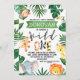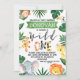 Os animais selvagens de um safari são o primeiro convite de aniversário. design que apresenta seis animais da selva, algumas palavras de folhagem e padrão animal. O primeiro convite de aniversário deste rapaz, na selva, ajudará a definir o cenário para uma festa de aniversário de temas safari selvagem.