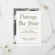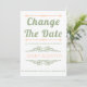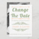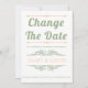 Vintage elementos e sage green e peach typoografia casamento Mude o anúncio de adiamento da data. Este elegante design de casamento exibe o texto "Alterar a Data" em negrito, a tipografia verde de sábio e os elementos de vintage que formam quadros para o texto. A parte traseira apresenta a foto do casal.