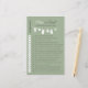 Entra nos teus hóspedes com este charmoso jogo minimalista "Adivinhem quem". A linha de roupa desenhada à mão com roupas pequenas de bebê em um fundo verde macio proporciona uma quebra-gelo perfeita e uma atividade divertida para o seu chá de fraldas. Este jogo faz parte da coleção de Chás de fraldas Minimalistas Clothesline, fazer que seja uma bela manutenção e uma maneira fácil de garantir que seu evento seja perfeitamente coordenado. ©Susanne Sachers - 🌞 da mente ensolarada