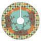 Uma bela saia das árvores de Natal apresenta três renas bonitas sobre um fundo de castanho, creme, aqua, laranja e mostarda argyle, uma faixa de laranja sólido, e um centro azul aqua com bolinhas brancas e flocos de neve.
