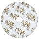 Uma decoração moderna e elegante de árvores de Natal, esta saia apresenta um padrão de Cartões de natal de ouro de 'Noel' com inscrições e decorações de ouros de aparência metálica, como canetas doces, chapéus de Papai Noel, caixas de presentes e flocos de neve e estrelas de ouro embutidas na inscrição.