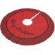 A red Christmas tree skirt with a red and black gingham check border. You can personalize the red portion with a saying such as, " Merry Christmas" or "Happy Holidays" or your family name ie "Williams Family" The text can also be deleted if you wish.