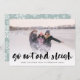 O cartão com fotos de feriado festivo apresenta sua foto favorita horizontal ou orientada à paisagem em cheio sangrando, com "saia e trenó" sobreposto em tipografia de pincel com letra preta. Personalize a frente do cartão com seus nomes e mensagens de feriado curtas, e adicione três fotos adicionais no verso em um layout de colagem em um fundo com padrão de floco de neve verde-claro, juntamente com uma mensagem pessoal personalizada. Para um vazio de volta, simplesmente exclua os modelos de fotos e a camada branca matte.