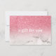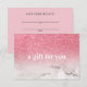 Moderno, cintilante e elegante com um toque de luxo, este cartão de presente é perfeito para muitos negócios, seja você um artista de maquiagem, cabeleireiro ou massoterapeuta, lojas de noivas, planejadores de eventos e muito mais. Com um fundo ombre de glitter rosa feminino cintilante desbotado para mármore branco e fonte em negrito, este estilo de design de cartão de negócios irá conectar com os clientes elegantes que você está procurando. Fica incrível atualizado para papel pearlizado. Um design versátil para profissionais criativos e empreendedores. Adicione a redação do certificado de presente desejado e as informações de contato do seu negócio no verso.