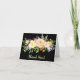 O preto dramático dá uma nova atitude ao cartão de agradecimento padrão! Este lindo arranjo floral amarelo limão, dourado tangerina e verde tem toques de cor adicionados, incluindo vermelho, violeta e azul. Fica deslumbrante em um fundo preto. O texto em letra cursiva dourada clara na parte inferior diz Obrigado! O interior deste cartão fica em branco para sua mensagem pessoal.