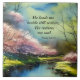 Um azulejo cerâmico de aspas inspiracionais retrata uma bela pintura a aquarela natural com um fluxo silencioso de água com árvores cor-de-rosa floridas e um céu azul. Ele apresenta uma parte da amada e encorajadora Bíblia Verse 'O Senhor é o meu Pastor', Salmo 23:2-3, "Ele me leva ao lado de águas calmas, ele restaura minha alma."