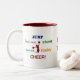Esta caneca caracteriza uma silhueta de um cheerleader no meio de uma colagem cercada salto das palavras salta, salta, dança, conluio, queda e elogio em azul, em verde, em vermelho e em amarelo/laranja. Há igualmente um placeholder para seu texto - seu nome, sua equipe do cheerleader ou uma mensagem relativa à promoção.