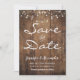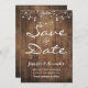Salve o cartão de data com fundo de madeira e luzes de fada. Escreva o seu próprio texto sobre o texto de amostra.