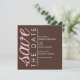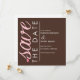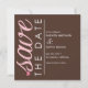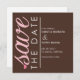 Este adorável anúncio Salvar a data contém a frase "salvar a data" em rosa e branco à esquerda do lançamento, e sua personalização à direita em branco.