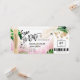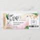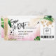 Destino Casamento na Praia Cartão de Embarque Bilhete Dourado Avião Salvar a Data com coração e ícone de avião com folhas tropicais