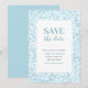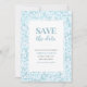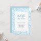 Convite para salvar a data em um padrão de mosaico azul aqua.