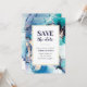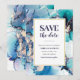 Convite para salvar a data com arte de tinta alcoólica azul roxa.
