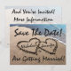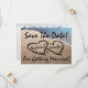 "Salve a Data!" está em texto elegante, ou facilmente altere a redação, é adicionado a esta bela e original fotografia profissional de dois corações escritos na areia ao longo da água azul do oceano para significar amor e romance. Insira facilmente o nome da noiva e do noivo em cada coração como mostrado, e a data abaixo deles. Coloque seu texto personalizado e detalhes e informações no verso deste convite popular. Ótimo conceito para próximos engajamentos de verão, casamentos na praia, aniversários e convites e anúncios de salve a data para o casal feliz.