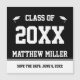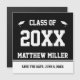Este anúncio de graduação em preto e branco diz "Classe de 2022" em grande texto branco. (Você pode mudar o ano se precisar.) Há texto de exibição que você pode editar para mostrar o nome do formando. Os bonés brancos estão de ambos os lados da frase "Classe de". Na parte inferior, há uma linha de texto de exibição em preto para sua mensagem de data de salvamento personalizada.